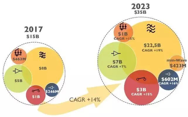 2017-2023年5G射频前端模块的市场规模发展趋势(图片来源:Yole)